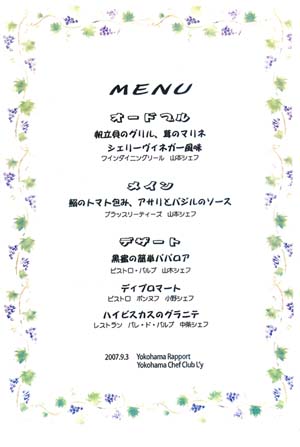 9月3日(月)天気晴れにみなとみらいの横浜美術館内のレストラン・ブラッスリーティーズみなとみらいで行われた恒例のみんなDEフレンチ(主催横浜ラポール)に参加した。 これは横浜シェフクラブ・リグレックの協力により本物のシェフとおいしいデザートを作り、リッチなランチを頂くというものです。 ※左の画像をクリックすると、拡大した画像がご覧になれます。  |